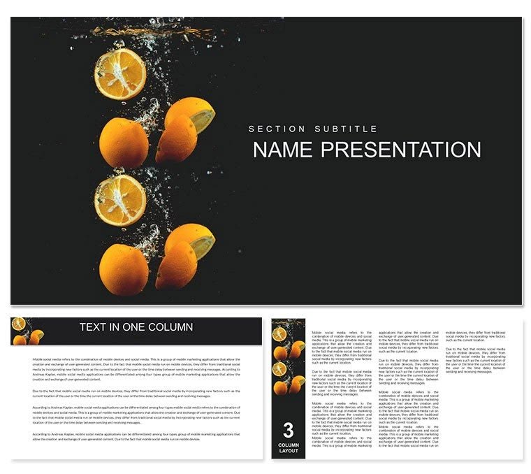Imagine quenching a sales team`s thirst for compelling visuals with slices of citrus bobbing in crystal water, symbolizing purity and vitality in every hydration story. The Orange Slices in Water PowerPoint template quenches that need, providing a refreshing canvas for food and beverage pros to splash data with flavor. This theme turns mundane metrics into mouthwatering insights, perfect for wellness trends and product launches.